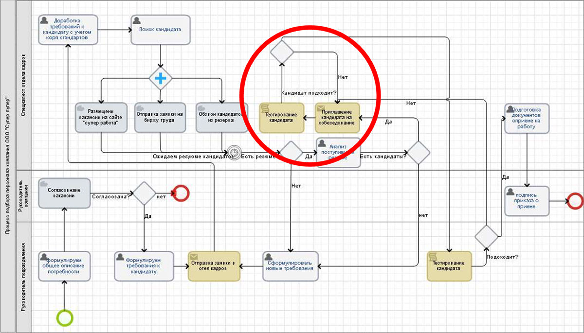 В данном бизнес-процессе обращаем внимание на то, что если кандидат не подошел в процессе тестирования, мы снова приглашаем кандидата.