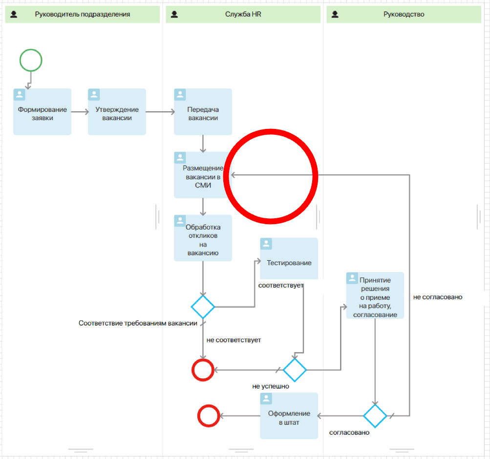 В этом бизнес-процессе, если кандидат не согласован, мы каждый раз заново размещаем вакансию в СМИ. Однако нужно всего лишь переместить стрелку на следующее действие: обработать следующие поступившие отклики на вакансии.