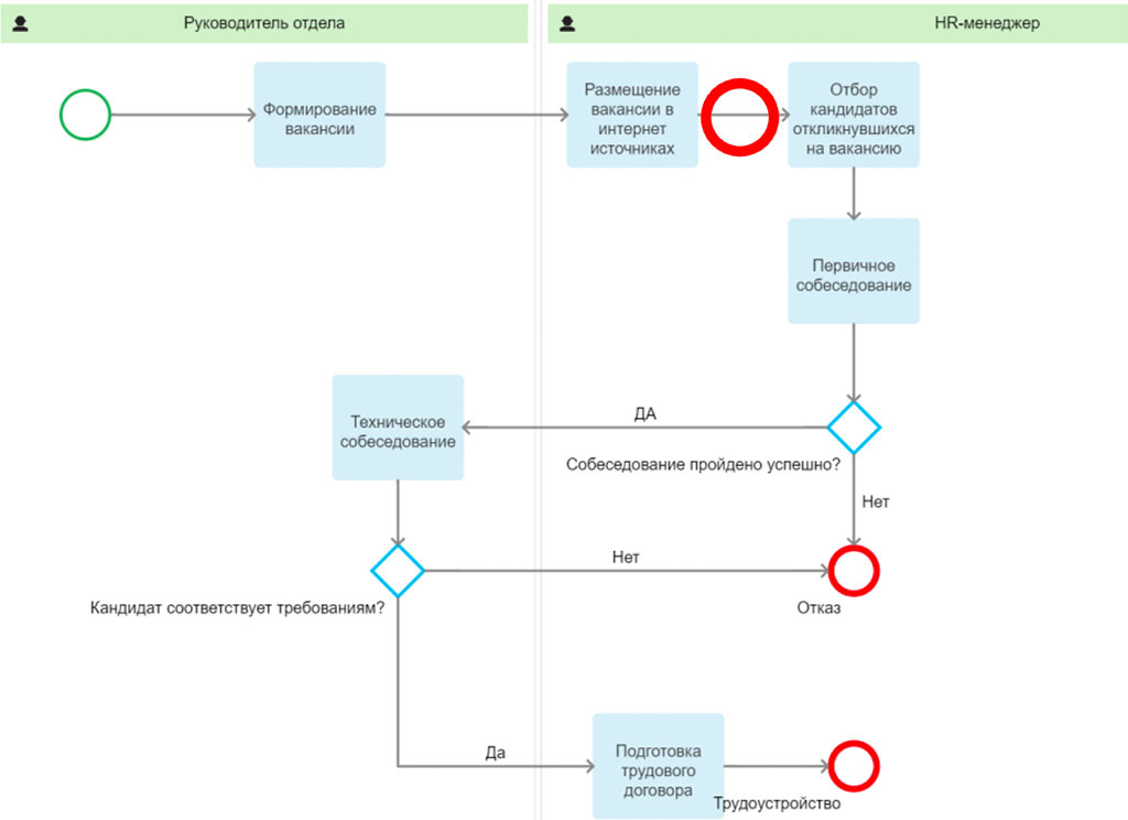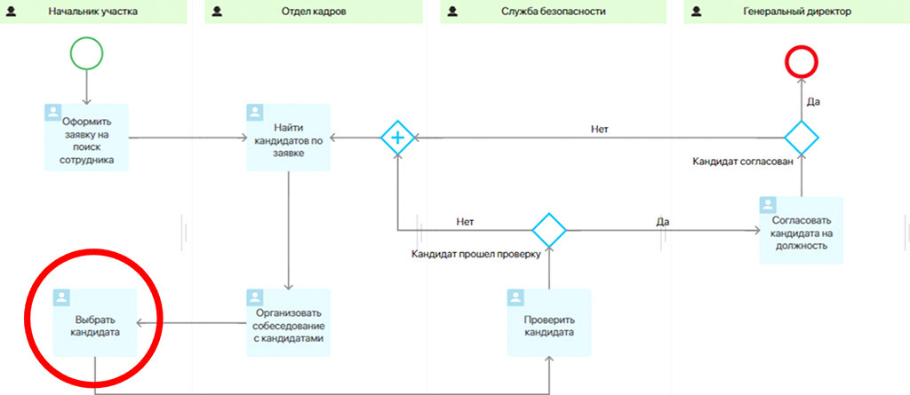 В нашем примере совершенно не ясно, что делать, если кандидата не выбрали. Чтобы оптимизировать процесс, нужно добавить шлюз «Выбрали?», и если кандидата не выбрали, продолжить его поиск.