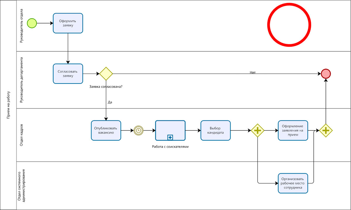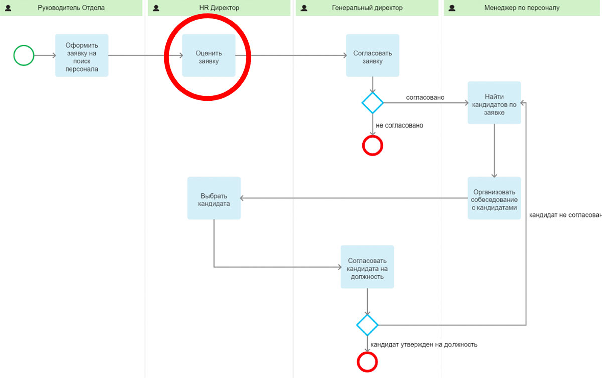 В данном случае непонятно, зачем HR-директор «оценивает» заявку на поиск персонала. Если он должен как-то скорректировать ее, то это нужно указать. Если он может отклонить или отправить на доработку, необходимо добавить соответствующие шлюзы.