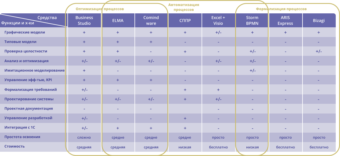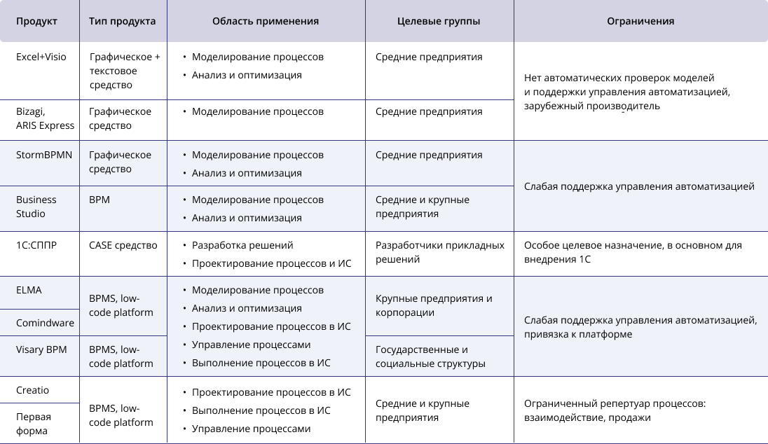 В таблице представлены краткие характеристики некоторых инструментов по типу, области применения и целевым группам. Поскольку в настоящее время всё более популярны отечественные продукты, сообщаем, что все представленные продукты являются отечественными, за исключением Bizagi, ARIS Express и решений от Microsoft (Excel и Visio).