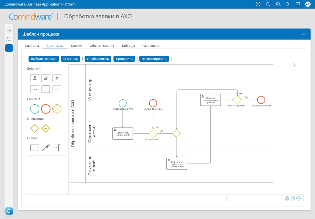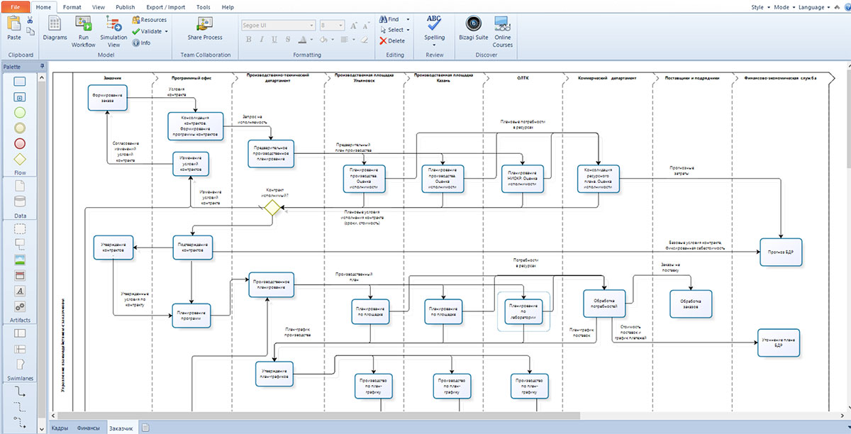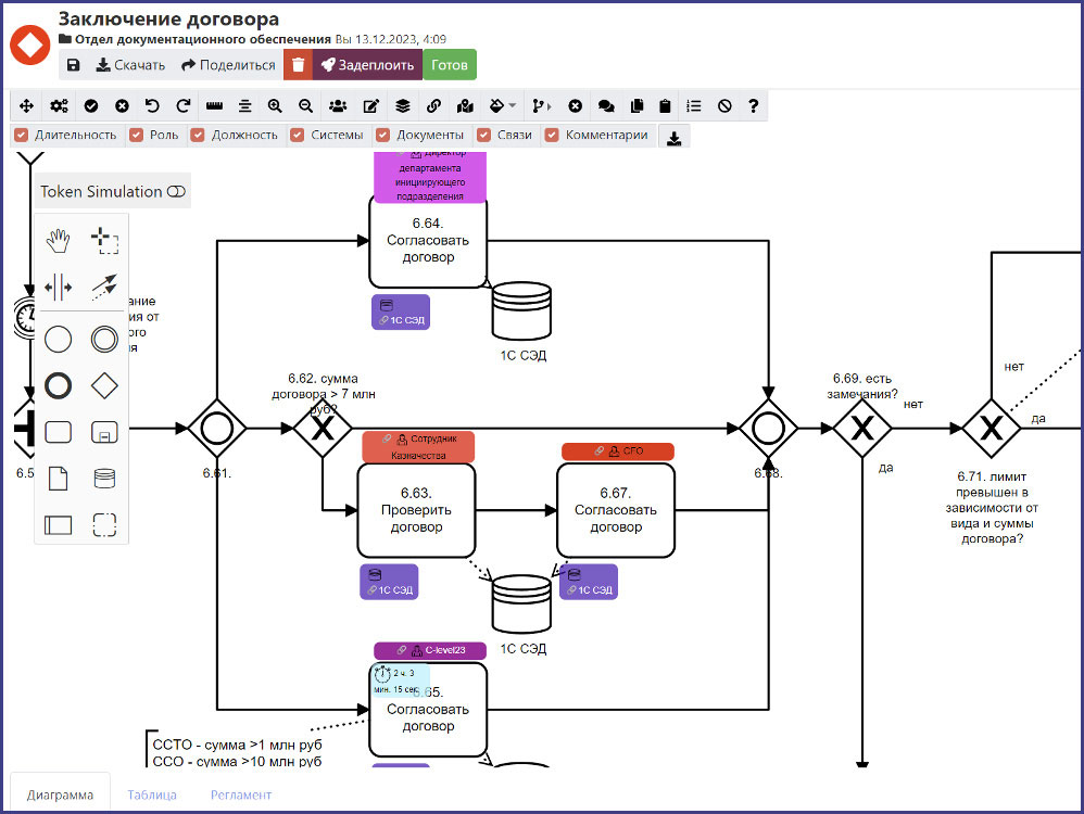 Основная нотация этой отечественной системы – BPMN. Возможна командная работа, заполняются атрибуты процесса и задач. Проверка качества диаграмм позволяет избежать типовых ошибок в моделировании, что особенно полезно новичкам. Есть функция проверки прохождения токена и оценки длительности сценариев процесса, что позволяет применять подходы к оптимизации моделей бизнес-процессов.