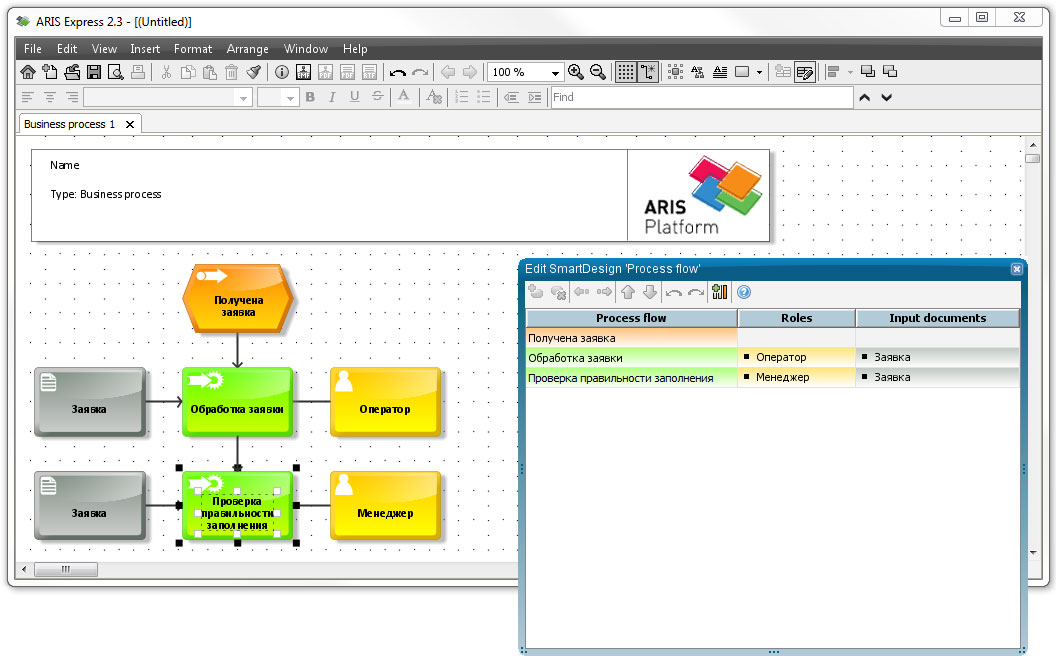 Если вы предпочитаете работать не только с нотацией BPMN, но и с eEPC, ARIS Express вам точно понравится. Инструмент позволяет моделировать сложные бизнес-процессы и заполнять атрибуты процесса. Можно описывать процессы не только в виде потоков работ, но и в виде потоков данных. Присутствует простая канбан-доска со статусами выполнения работ, но в качестве дополнительного инструмента, не связанного с процессами.
