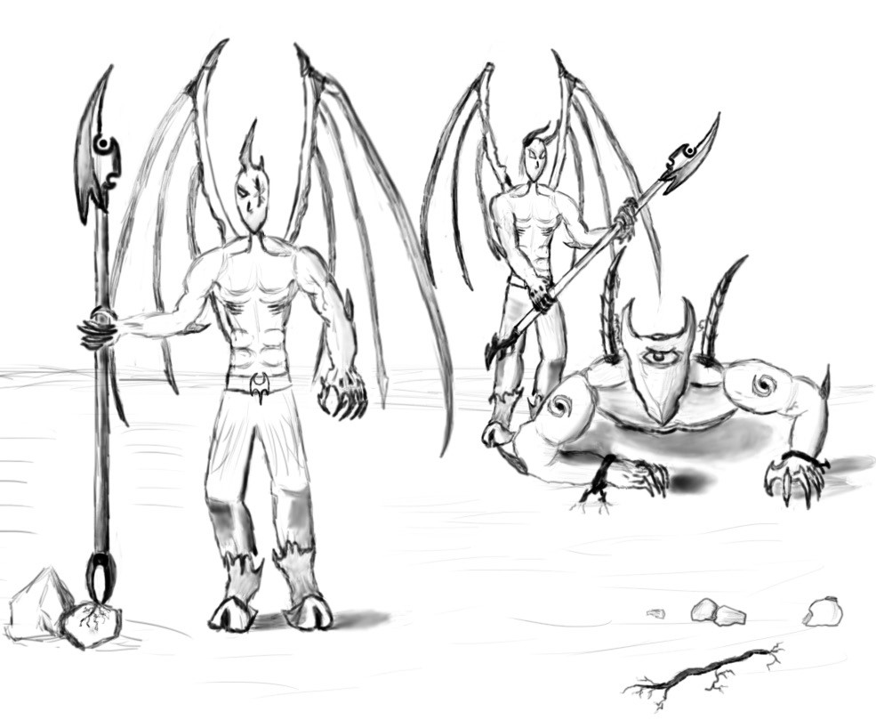Перед Наташей стояла фигура, похожая на человека, но опять же без рта… За его спиной находились два огромных крыла, глаза пылали так же, как и у Похоти, но другим цветом. Такого свечения в реальном мире девушки ещё никогда не видели. Оно было похоже по цвету на темно-фиолетовый, хотя нельзя было сказать однозначно. Руки были когтистыми и ужасно сильными. В одной из них существо держало что-то похожее на копье. Позади него виднелась ещё одна такая же фигура, державшее Влечение, которое было приковано к Земле какими-то кандалами, а в его горло упирался острый наконечник. Видимо, он не успел приметь свою нечеловеческую силу.