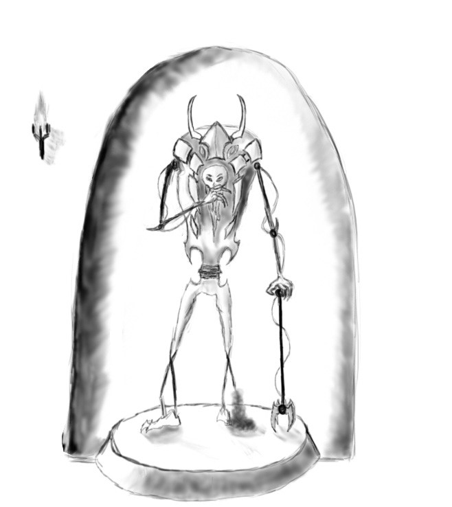 И тут Наташа увидела того, с кем они говорили. Очередной их знакомый стоял в какой-то своеобразной нише, вдали от стола и трибун. Его тело было очень странной формы. Ноги и руки напоминали тростниковые палки, которые могли сломаться от одного лишь дуновения, а тело напомнило раздувшийся шар, покрытый панцирем. Голова же Алчности была в самом центре его тела. Привычное для этого мира свечение из глаз имело зеленоватый оттенок.