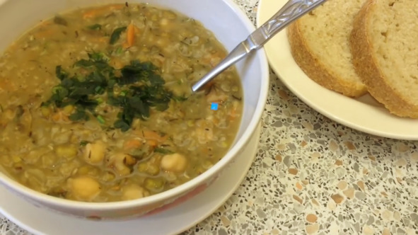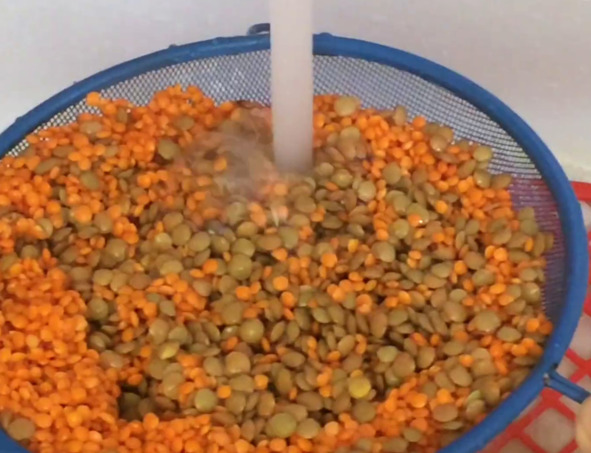 Затем поместить в кастрюлю зёрна (семена) «Маша» и предварительно варить 15 минут. По истечении этого времени варки, в кастрюлю высыпать «Красную чечевицу» и варить до готовности всех бобовых. Бульон со сваренными бобами не солить.