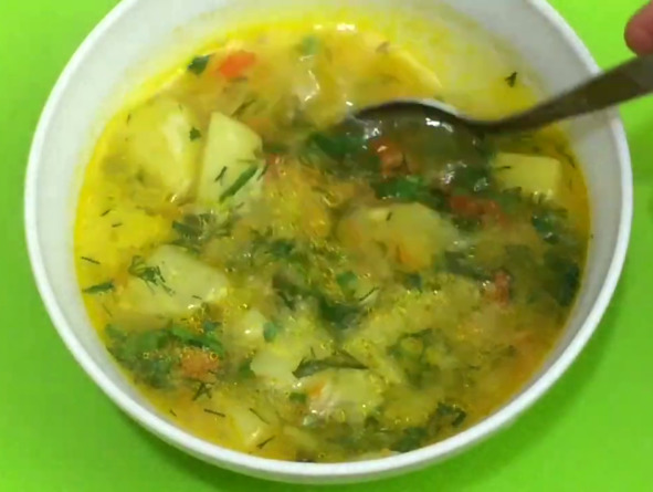 Через 3 минуты насыпать в кипящий суп жменю, другую зелени (укроп +петрушку) по вкусу, закрыть кастрюлю крышкой, выключить плиту, а через 2—3 минуты можно разливать по тарелкам и обедать.