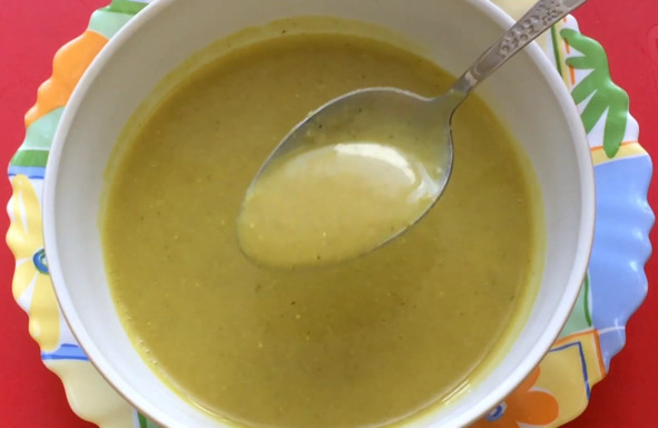 Суп-пюре приобретёт приятный горчичный цвет и будет готов к разливу по тарелкам и подаче к столу (к обеду).