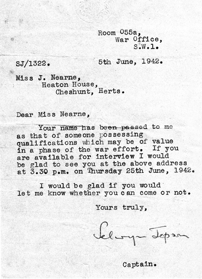The address that Captain Jepson gave was Room 055a, War Office, SW1. Jacqueline wrote back immediately, saying that she would be pleased to meet him on 25 June. She told Didi about it but asked her not to say anything to anyone else, as the letter was vague enough either to be something very important or to mean nothing at all; she was also beginning to feel embarrassed about her difficulties in obtaining employment. Jacqueline was eager to know what this ‘phase of the war effort’ meant, but she had nearly three weeks to wait until the appointed date and the time passed slowly. Didi was also impatient to receive her own letter inviting her for an interview, which she was convinced would soon arrive. It didn’t and, as the time got closer for Jacqueline’s interview, Didi kept reminding her to ask why she hadn’t been invited too. Jacqueline had to promise her several times that she would make a point of asking before her sister was satisfied.