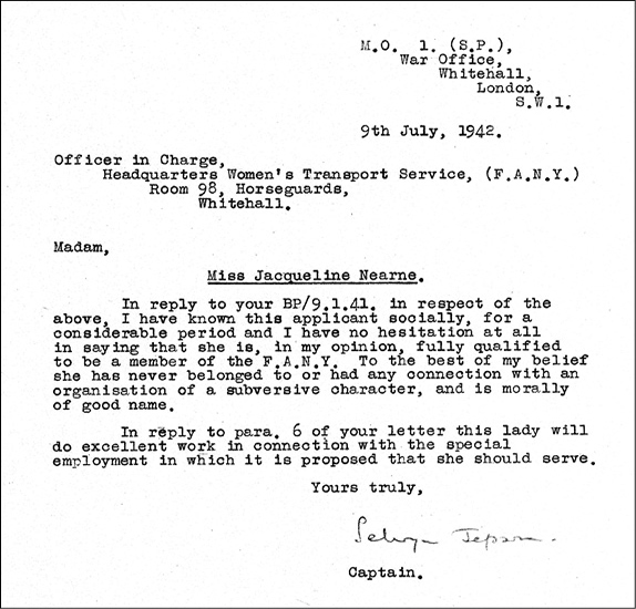 Didi’s suspicion that her sister had been keeping something from her continued to trouble her. Then Jacqueline received the news that the interview had been successful, and within two weeks of her interview had passed a medical and completed the application form to join the FANY. In order to be accepted she needed sponsorship in the form of recommendations by two people; one had to be a woman, and both had to have known her for at least two years. Her sponsors were Lieutenant Prudence Macfie of the FANY and Captain Selwyn Jepson, neither of whom had known Jacqueline for more than two weeks.