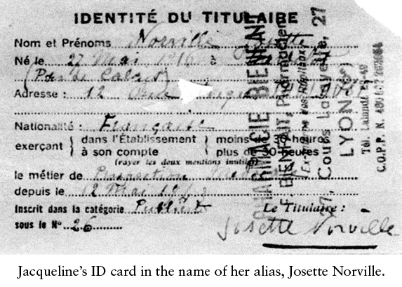 She was washing her underwear in the basin in her room when there was a knock at the door. Believing it to be an expected visit from a member of the Resistance, Jacqueline hurriedly opened the door to be confronted by a plain-clothes policeman. Genuinely dismayed about being caught with her wet undergarments still in her hand, she began to blush and stammer her apologies for coming to the door in such a state. The young policeman was also flustered, and their mutual confusion diffused the situation. He asked for her papers, she produced them, and he gave them a cursory look before handing them back and fleeing in embarrassment.
