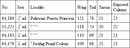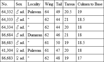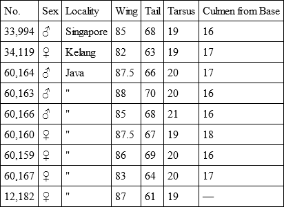 Remarks. – Birds from Java are small and appear to be quite like those from Singapore and the southern Malay peninsula. The Borneo bird is a little larger and the one female before me is gray above as in the Philippine form.