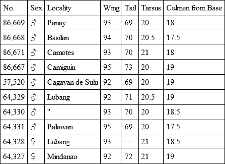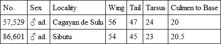 Remarks. – There are, in the U. S. N. M., three skins from Sibutu similar in all respects to ours.