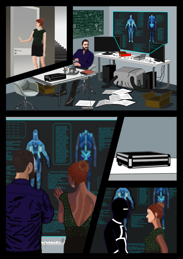 Миа открыла дверь и застала такую картину в комнате. Вся она превратилась в мастерскую: железный стол был откинут от стены, на другую была выведена сенсорная модель костюма с какими-то улучшениями, через всю комнату была протянута труба, которая даже не будучи прозрачной, отдавала белым свечением, а в другом конце комнаты стояла капсула с костюмом. Дункан сидел за столом и паял какую-то железную конструкцию в резиновой одежде под костюм.