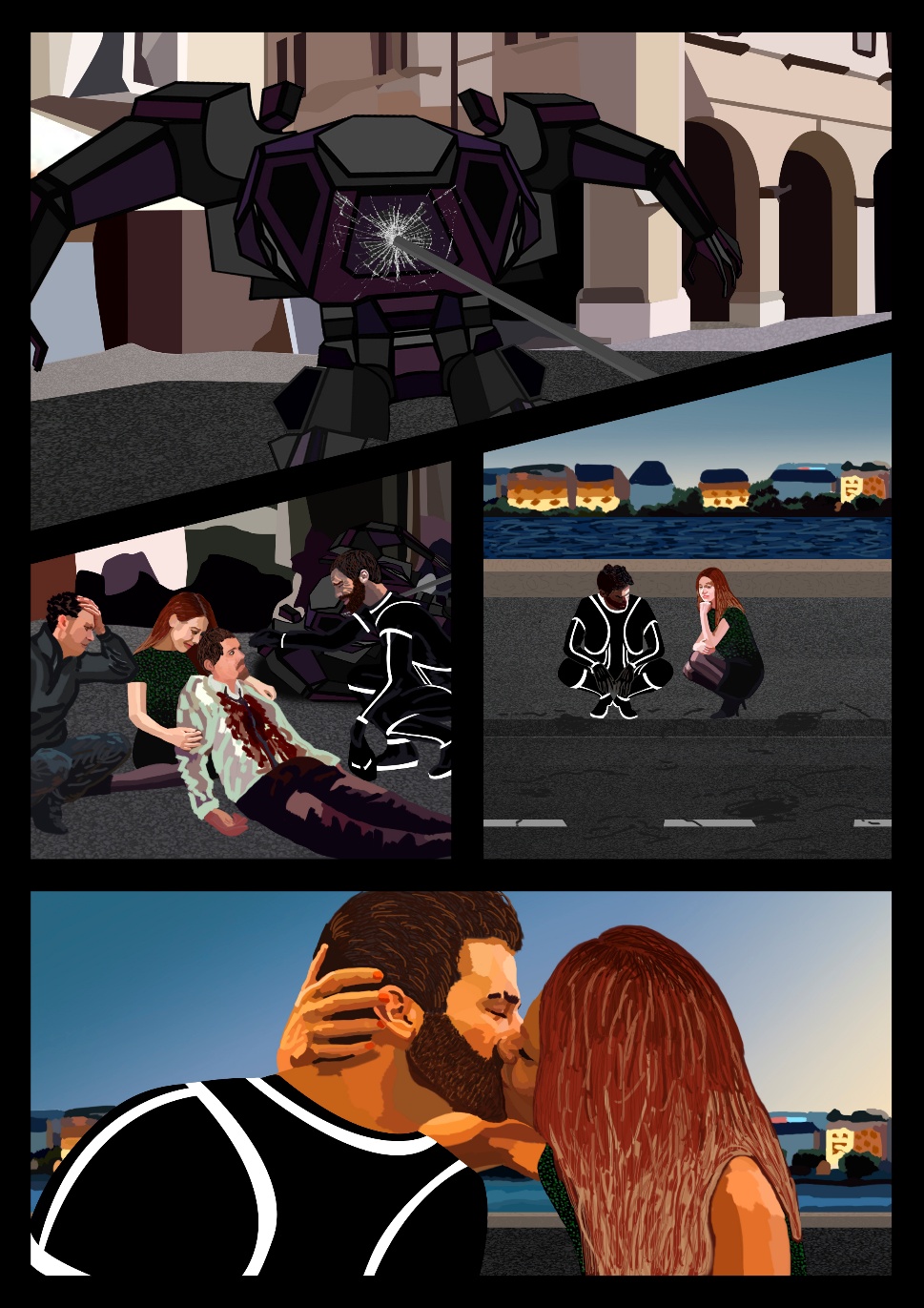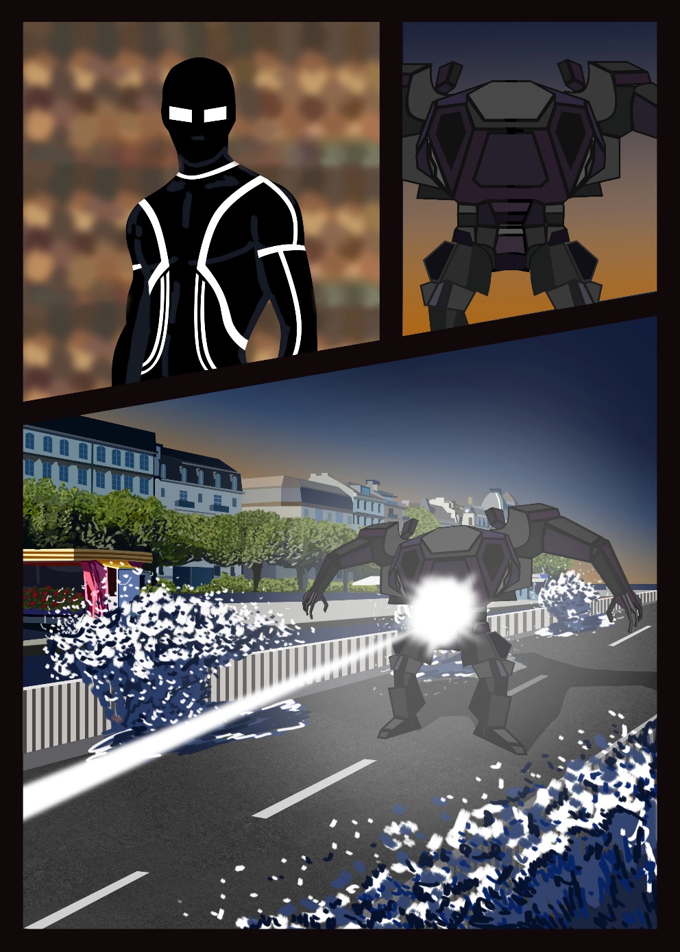 Дюк начал привставать, как тут же ему в спину прилетело ещё два залпа. Из-за домов, как будто в нём кто-то был внутри, выскочил костюм, перепрыгивая с крыши на крышу, он понёсся к Дункану. Тот, подпрыгнув, как вчера на мосту за счёт мощного энергетического выброса, поймал кисти костюма в прыжке, и он намагнитился на его экзо скелет прямо в воздухе. Дункан эпично, как в фильмах про супергероев, приземлился на мост в сияющем костюме.