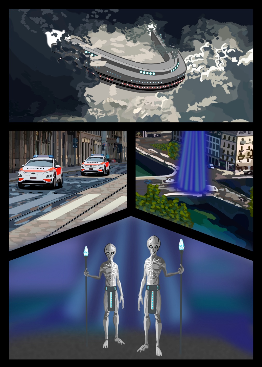 К мосту, над которым завис корабль, начали съезжаться полицейские машины. Все служащие достали пистолеты и навели на НЛО.