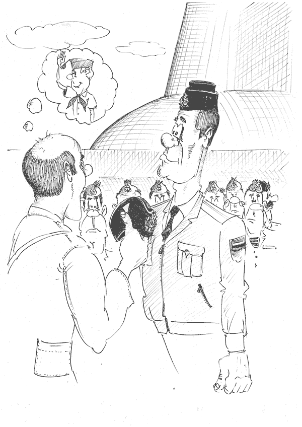 Командир с интересом оглядел строй, не нашёл ни одной такой пилотки. Потом снял свою с головы, посмотрел, подумал, сказал «ну ладно» и пошёл дальше.