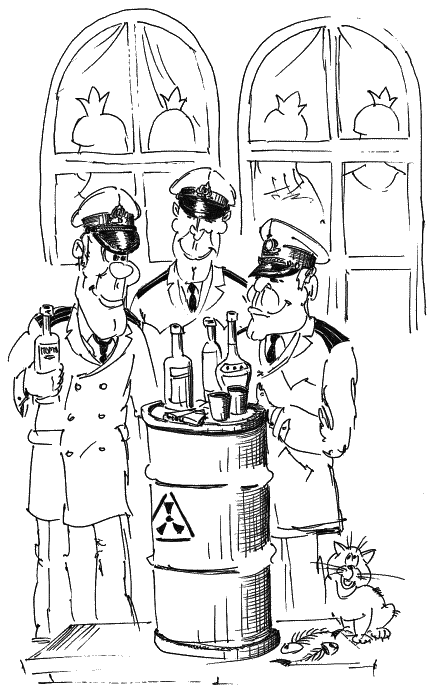 Ладно, идём на пирс. У трапа стоит огромный овчинный тулуп в валенках. На тулупе висит автомат, а внутри тулупа торчит верхний вахтенный матрос. Возле него лежат и ждут наших ласковых касаний четыре двухсотлитровые бочки с гидравликой. Курим. Ходим вокруг бочек. Пинаем их ногами. Бочки продолжают равнодушно лежать.