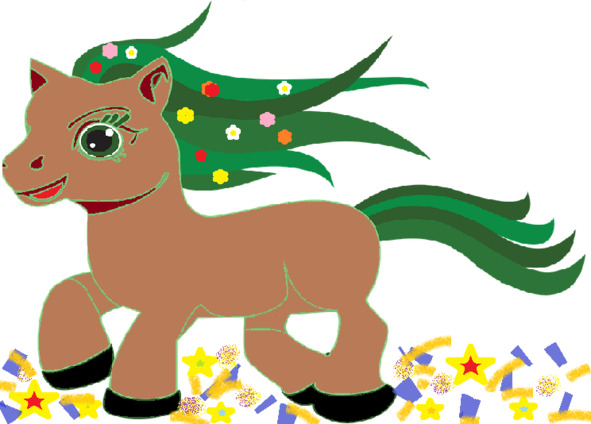 С лёгкостью ветра,По звёздной дорожке,Скачет лошадка – быстрые ножки!Скачет лошадка —Добрая пони, —В гриве ромашки, маки, пионы!Милая пони —Чёрные глазки,Детям подарит добрые сказки.