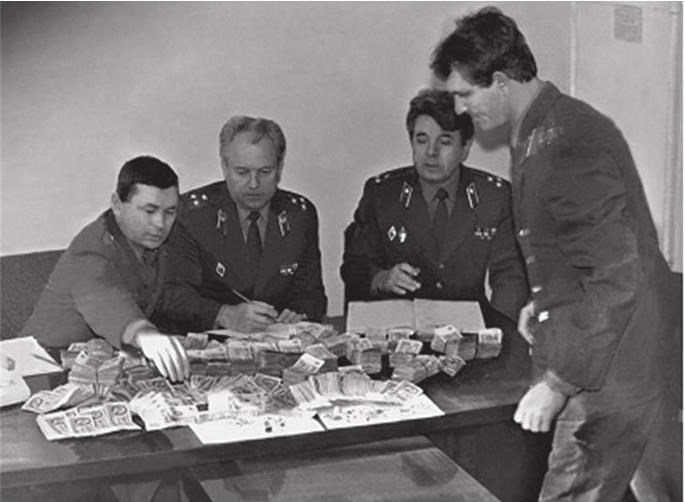 Результаты реализации уголовного дела по контрабанде 41 кг наркотиков. Слева направо сидят: заместитель следственного подразделения особого отдела Туркестанского военного округа (Ташкент) майор А.М. Левашов, полковник М.Я. Овсеенко, начальник следственного подразделения этого же округа полковник Т.В. Дерень. Ташкент, 1985 г. (Из архива М.Я. Овсеенко)