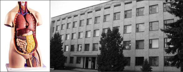 На фото: 1.муляж внутренних органов человека.2.Типичный корпус райкома.