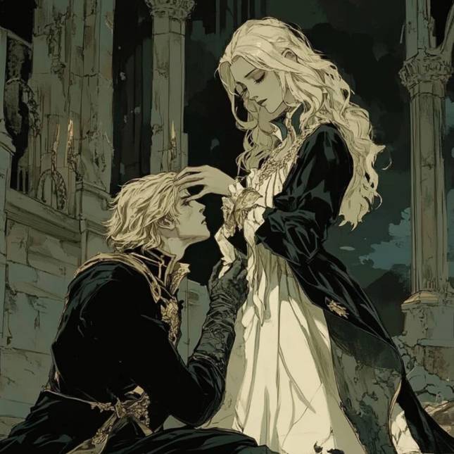Он подошёл к ней и, немедля ни секунды, позволил своей форме исчезнуть. Демоническая оболочка растворилась, как дым под дождём: когти втянулись, рога исчезли, крылья сжались и рассыпались прахом. Его тело вытянулось, стало тоньше, уязвимее – человеческим. Мгновение – и на месте древнего демона стоял мужчина: высокий, в строгом плаще, с лицом, в котором читалась и усталость веков, и пламя желания жить иначе.