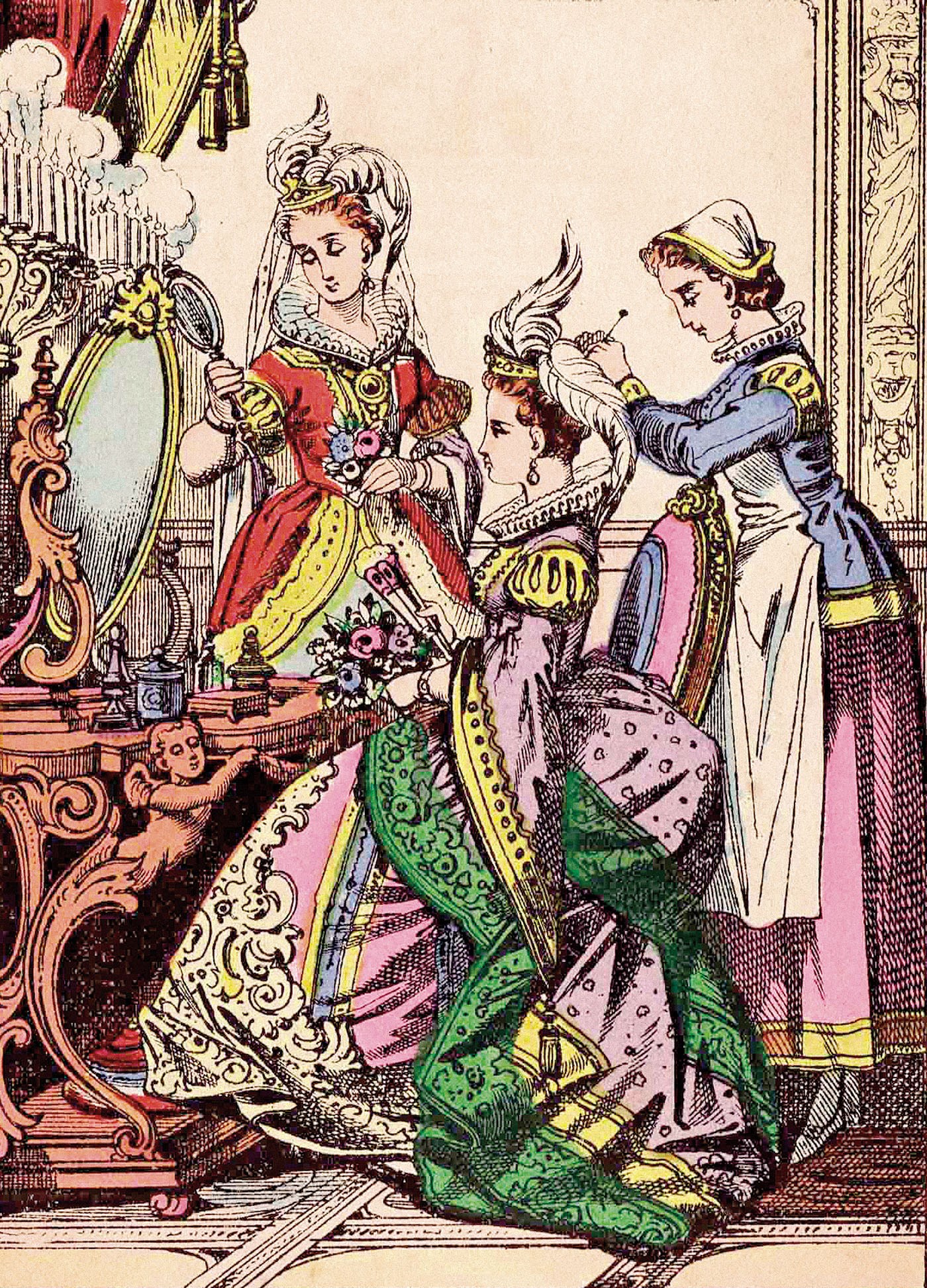Чтобы сделать талии этих неуклюжих толстух потоньше, позвали кучера, и он так затянул шнурки корсета, что едва не сломал ребра неуклюжим модницам, и они чуть не задохнулись. Но потом попривыкли и, взглянув в зеркало, пришли в восторг.