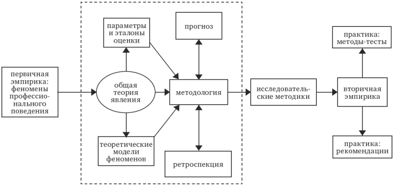 На рисунке 1 дана принципиальная схема методов исследования различных уровней и проблем социальной реализации профессионала: от первичной эмпирики, сбора и систематизации фактов, их концептуального обобщения, к созданию теоретических моделей исследуемых феноменов и к разработке методологических принципов, приемов и методов их исследования, – до конкретных приложений и адаптации методов к решению прикладных задач диагностики и выработки рекомендаций.