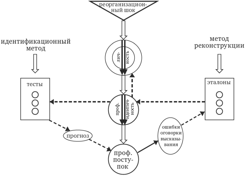 Структура проективно-реконструктивного метода такова. Исходная позиция – профессиональный поступок (нижний круг на схеме); процедура исследования – проективное сравнение поступка с тремя эталонами (правая траектория); содержание метода – реконструкция мотивационно-ценностной основы поступка профессионала. Психологическая реконструкция включает несколько аспектов. Во-первых, каждый профессиональный поступок оценивается с позиции всех трех эталонов и располагается на континуальной шкале идентичность/маргинализм. Во-вторых, поступки группируются по признаку нарушений в тех звеньях системы «человек-профессия-общество», которые привели к их неадекватности. В-третьих, проводится сравнительный анализ и систематизация типичных деструктивных поступков и вероятностное моделирование их ценностно-мотивационной основы.