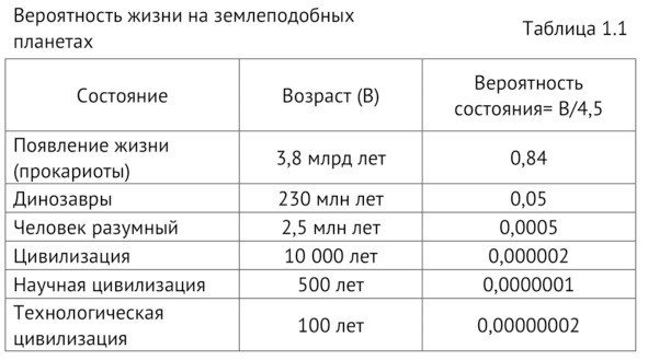 Таким образом, в нашей Галактике более 5 триллионов планет с временем жизни 10 миллиардов лет (например, «Желтые карлики», к которым относится и наша Земля, на которой жизнь появилась в возрасте 3,8 млрд лет), где возможно появление разумной цивилизации. Какова вероятность того, что на Земле или землеподобной планете будет разумная жизнь при возрасте планеты 4,5 миллиардов лет?