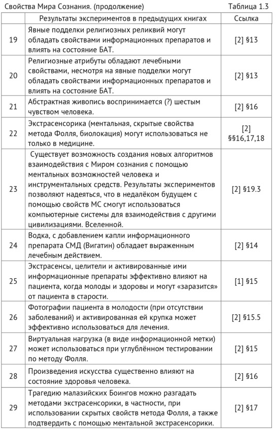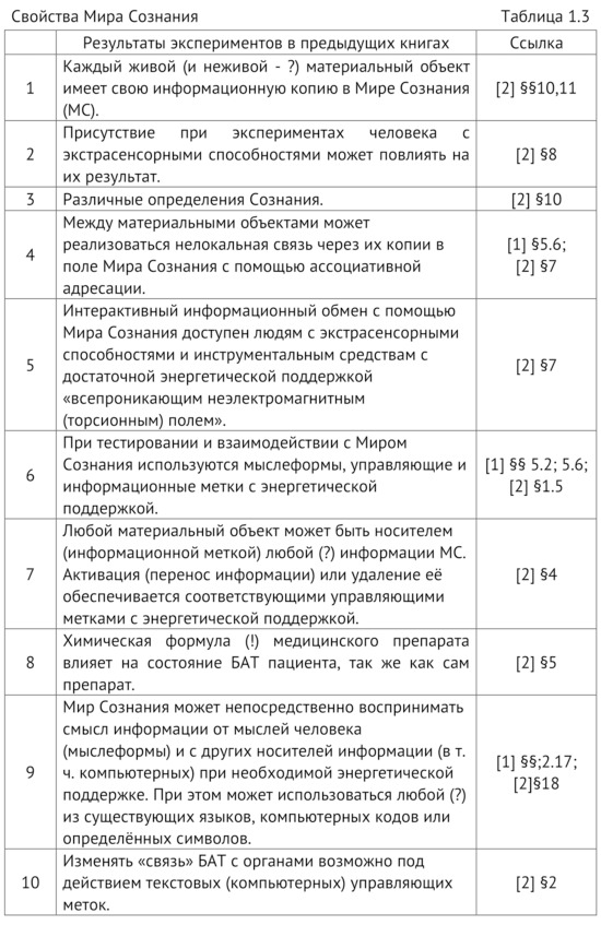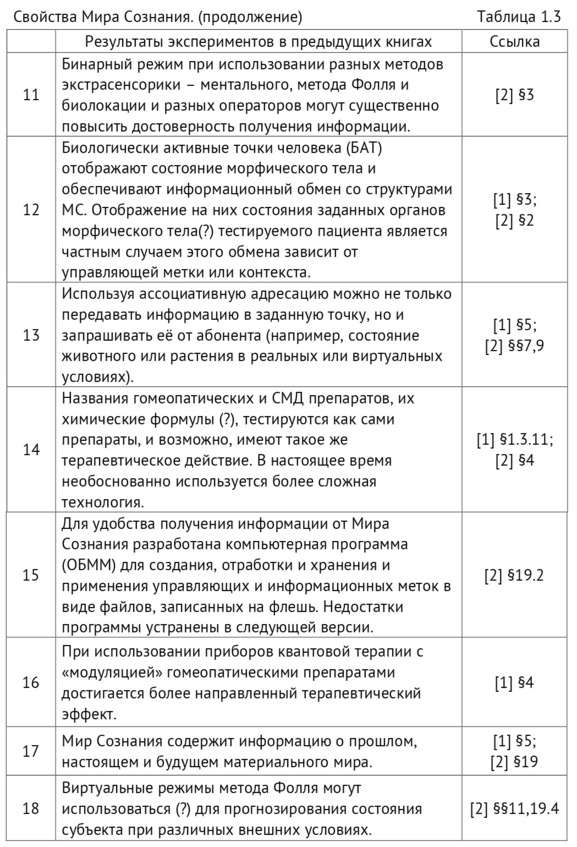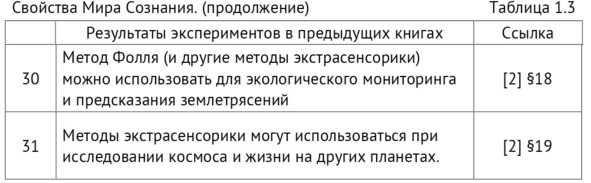 В таблице 1.3 указаны разделы этих книг, в которых приведены эксперименты, основные результаты которых позволяют рассматривать их в качестве свойств Мира Сознания.