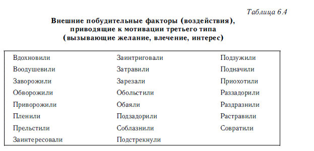 Л. И. Божович, развивая эти положения К. Левина, считает, что предметы, постоянно удовлетворяющие ту или иную потребность, как бы фиксируют в себе эту потребность, в результате чего они и приобретают способность побуждать поведение даже в тех случаях, когда соответствующая потребность не была предварительно актуализирована: первоначально эти предметы только реализуют (удовлетворяют) потребности, а затем начинают их вызывать (табл. 6.4).