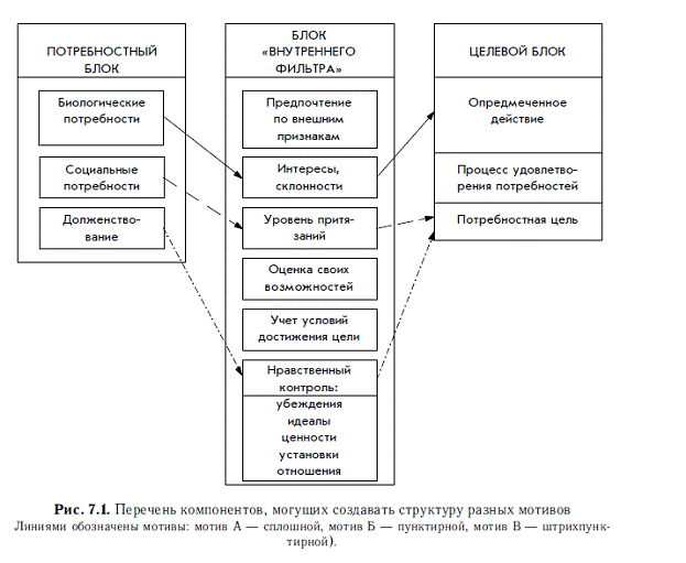 В потребностный блок входят следующие компоненты: биологические и социальные потребности, осознание необходимости, долженствования («квазипотребности» по К. Левину); в блок «внутреннего фильтра» – нравственный контроль, оценка внешней ситуации, оценка своих возможностей (знаний, умений, качеств), предпочтения (интересы, склонности, уровень притязаний); в целевой блок– образ предмета, могущего удовлетворить потребность, опредмеченное действие (налить воды, решить задачу), потребностная цель (удовлетворить жажду, голод и т. п.), представление процесса удовлетворения потребности (попить, поесть, подвигаться и т. п.). Все эти компоненты мотива могут проявляться в сознании человека в вербализованной или в образной форме, притом не все сразу. В каждом конкретном случае в каждом блоке может быть взят в качестве основания действия или поступка (принимаемого решения) один из компонентов. Структура же каждого конкретного мотива (т. е. основания действия) строится из сочетания тех компонентов, которые обусловили принятое человеком решение. Таким образом, компоненты, как кирпичики, позволяют создать здание, именуемое мотивом. Образ этого «здания» закладывается человеком в память и сохраняется не только в момент осуществления действия или деятельности, но и после их завершения. Поэтому о мотиве можно судить и ретроспективно (но не только ретроспективно, как утверждают Ю. М. Забродин и Б. А. Сосновский, 1989).