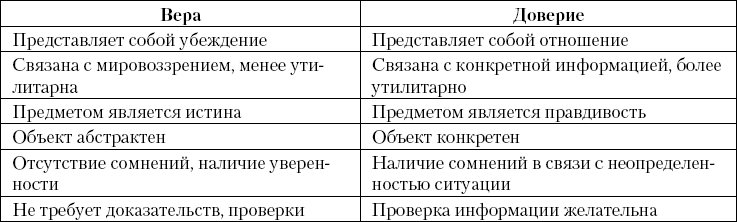 Если выделить основные различия между верой и доверием, то они выглядят следующим образом (табл. 1.1).