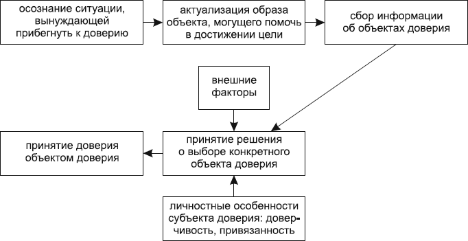 Первый этап – возникновение потребности (нужды) в доверительном отношении к кому- или чему-либо. Вынужденность такой потребности обусловливается ситуацией, в которой оказывается человек. Такими ситуациями являются: