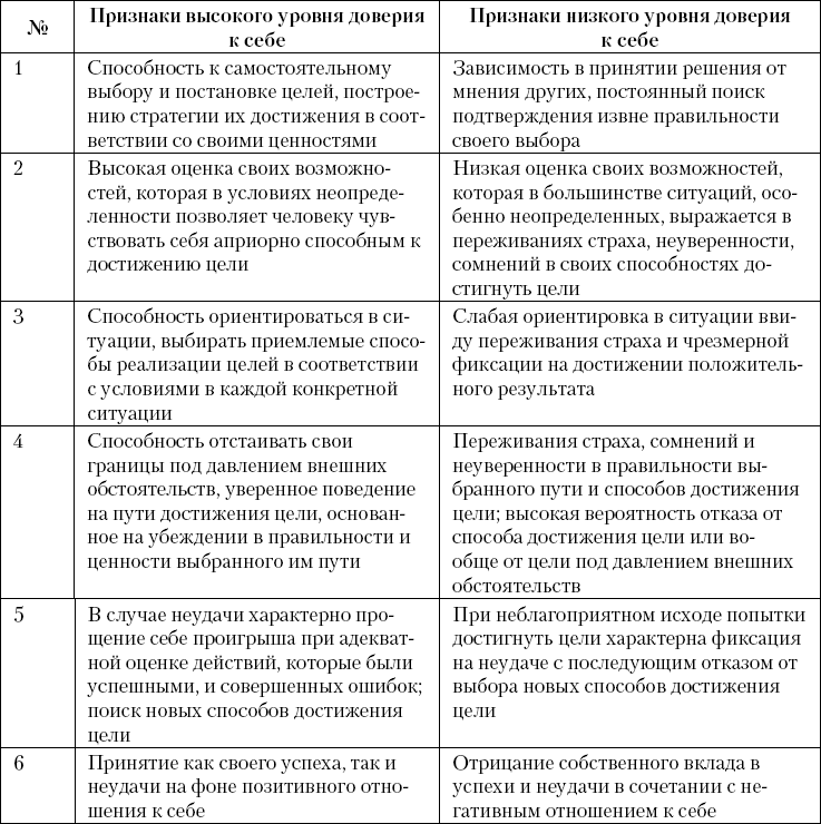 В табл. 2.1 представлены феноменологические проявления низкого и высокого уровня доверия к себе, выделенные Н. Б. Астаниной на основе анализа описания феномена доверия себе Т. П. Скрипкиной.