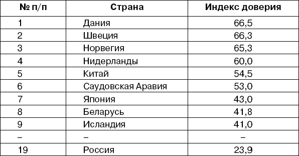 Даже при беглом взгляде на таблицу сразу видно, что высокий уровень доверия характерен прежде всего для стран Скандинавии и Северной Европы, которые отличаются и высоким уровнем жизни, и социальной стабильностью, и устойчивыми темпами человеческого развития.