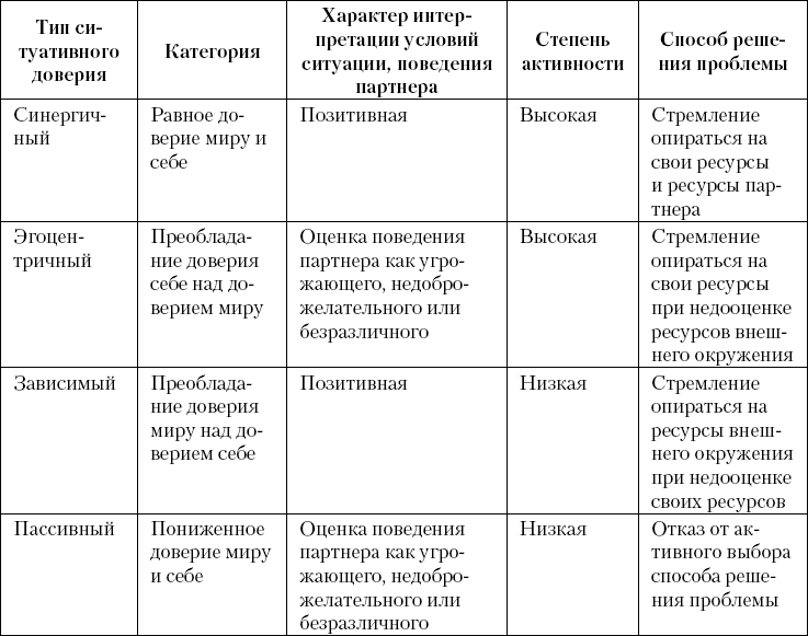Н. Б. Астанина (2011) выделяет типы ситуативного доверия и дает им характеристику (табл. 2.2).