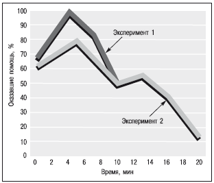 Эксперимент, проведенный Элис Айзен, Маргарет Кларк и Марком Шварцем (Isen, Clark, Schwartz, 1976), заключался в следующем: помощник экспериментатора звонил людям, которые не позднее чем за 20 минут до его звонка получали в подарок канцелярские принадлежности. Сказав, что ошибся номером и что у него больше нет мелочи для автомата, он просил ответившего ему человека оказать любезность и перезвонить по нужному ему номеру. Как следует из данных, представленных на рисунке, в течение первых пяти минут после получения подарка готовность прийти на помощь растет, а затем – по мере того как «улетучивается» хорошее настроение – идет на убыль.