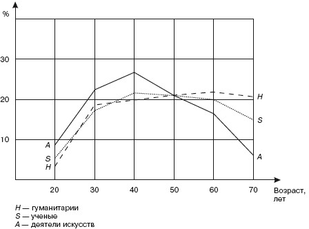 Рис. 1.1. Процентное соотношение общей продуктивности творческих людей в зависимости от сферы деятельности и возраста (по Botwinick, 1967)