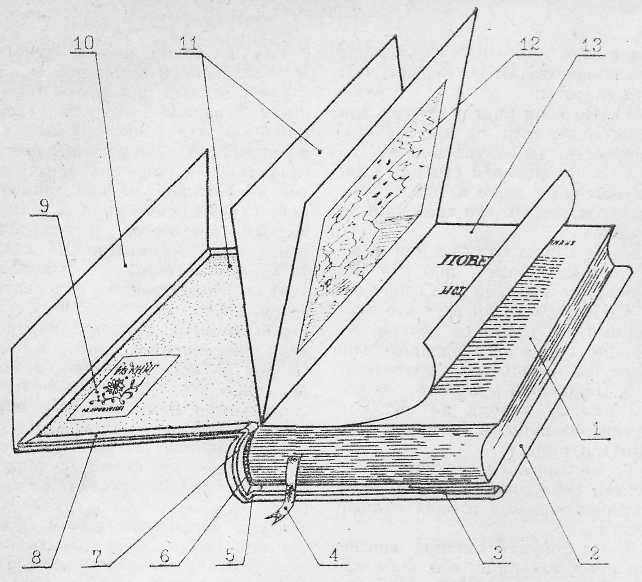 Рис. 1. Книга: 1 – книжный блок; 2 – суперобложка; 3 – переплетная крышка; 4 – ляссе; 5 – рубчик; 6 – каптал; 7 – корешок; 8 – кант; 9 – экслибрис; 10 – клапан суперобложки; 11 – форзац; 12 – фронтиспис; 13 – титульный лист