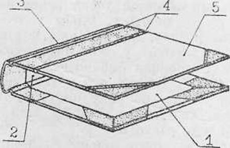 Рис. 2. Переплетная крышка: 1 – картонная сторонка; 2 – отстав; 3 – корешок; 4 – рубчик; 5 – покровный материал