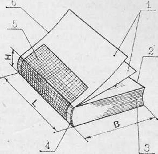 Рис. 3. Книжный блок: 1 – форзац;. 2 – передний обрез блока; 3 – нижний обрез блока; 4 – каптал; 5 – марля; 6 – верхний обрез блока; В – ширина блока; L – длина блока (высота); Н – толщина блока