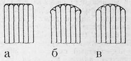 Рис. 14. Формы корешков книжных блоков: а – прямой; б – кашированный; в – кругленый
