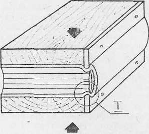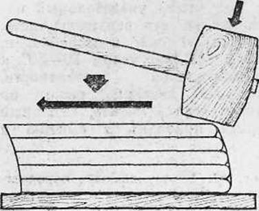 Чтобы из прямого к о р е ш к а сделать закругленный, блок кладут на стол и, прижав его к поверхности стола, легкими ударами киянки придают корешку округлую форму. Сначала сдвигают верхнюю кромку корешка и прилегающие к ней тетради до середины блока, а затем, перевернув блок, обрабатывают так же и вторую его половину (рис. 15). Для сохранения скругленной формы корешка блок зажимают в струбцину и окончательно проклеивают его корешок. Сушить корешок блока необходимо под прессом.