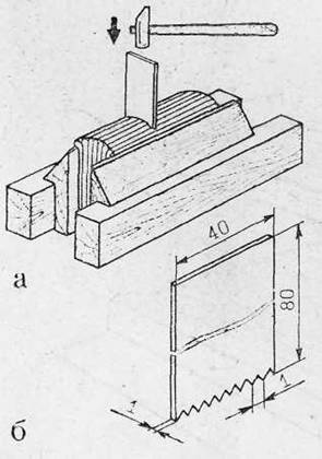 Если нет кашировки, ее несложно сделать из стальной пластины (подойдет лезвие от рубанка). Сточив режущую часть, трехгранным напильником наноосят на торце пластины неглубокие зубцы (рис. 16, б).