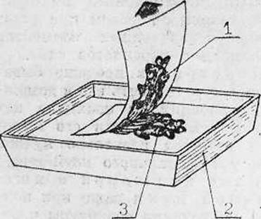 Рис. 17. Изготовление «мраморной» бумаги: 1 – лист бумаги; 2 – кювета с водой; 3 – краска на водной поверхности