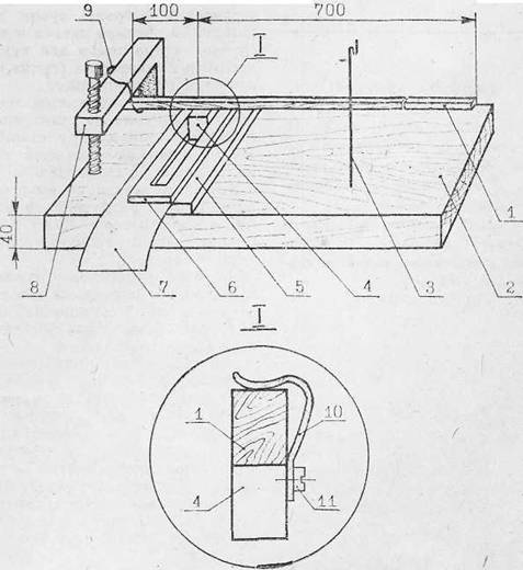 Рис. 22. Рычажный пресс для золотого тиснения: 1 – рычаг; 2 – основание; 3 – стойке для удержания рычага в нерабочем положении; 4 – медная плашка; 5 – переплетный материал, на котором тиснится надпись; 6 – рамка-трафарет; 7 – переплетная фольге; 8 – струбцина; 9 – резиновое кольцо дпя удержания рычага; 10 – пружина; 11 – винт