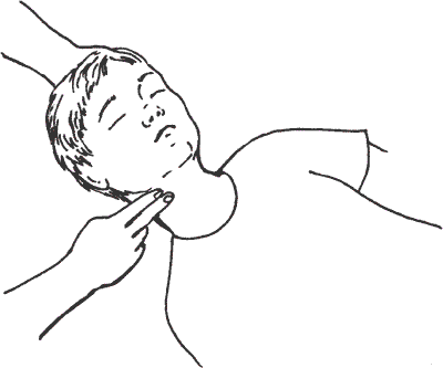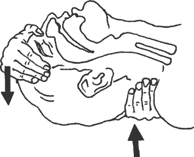 Если пострадавший находится в положении лежа на спине и без сознания, то вероятно западание корня языка. В этом случае искусственное дыхание будет безрезультатным. Для восстановления проходимости дыхательных путей требуется положить одну руку на голову пострадавшему в области линии роста волос, а второй рукой захватить его подбородок. Потом, нажимая на голову, запрокинуть ее первой рукой и вывести подбородок вперед второй рукой. Рот пострадавшего при этом приоткроется. Затем указательный и средний пальцы левой руки вводят в рот и исследуют ротовую полость. При необходимости удаляют инородные тела. Для удаления слизи, крови и другого можно обмотать пальцы салфеткой.
