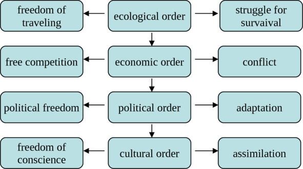 Park identified four phases of the evolution process from the biotic to social level: the ecological, economic, political and cultural orders. Accordingly, there exist four forms of socialization, namely, competition – struggle for survival on the biotic level, conflict on the economic level, adaptation on the political level and assimilation – on the cultural level.